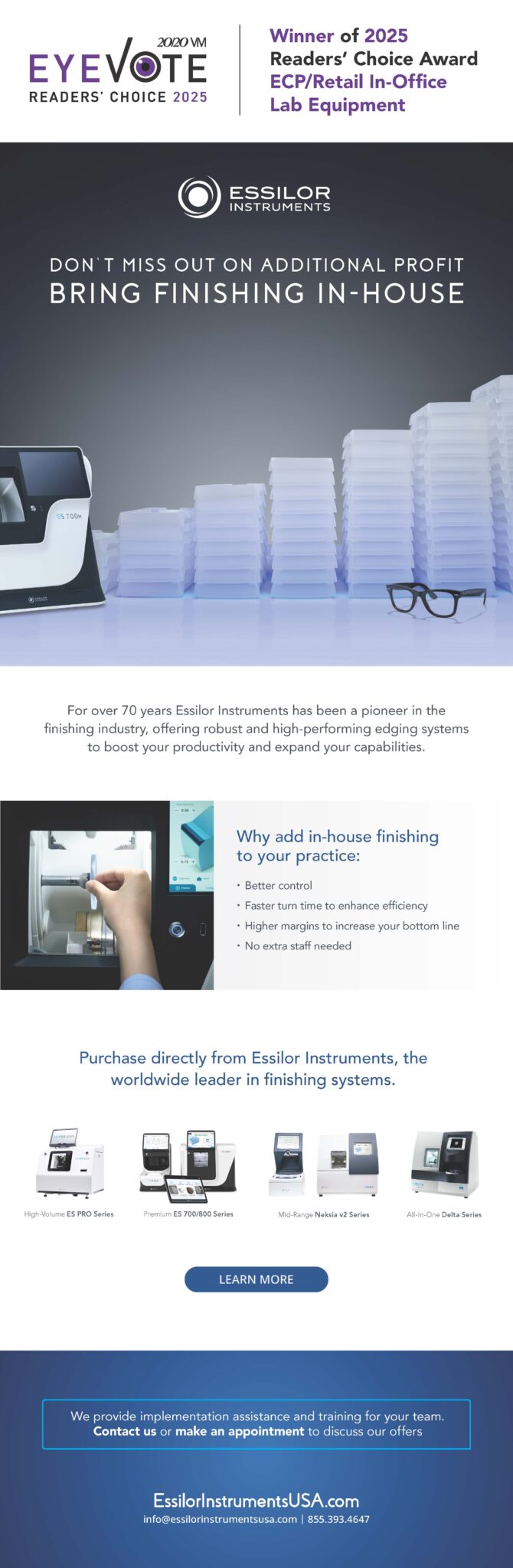 Benefits of in-office finishing with Essilor Instruments, the 2025 EyeVote Readers’ Choice Award winner in the category of ECP/Retail In-Office Lab Equipment.