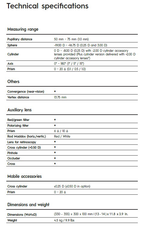 - Extensive range of lenses and filters to guarantee quality refractions in far and near vision
