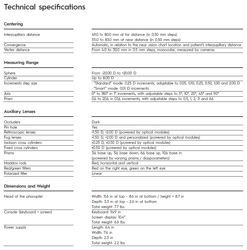 - Remote consultation is possible by taking control of all phoropter functions from a distant practice through compatible platforms.